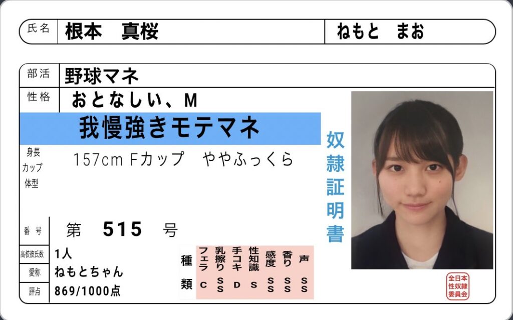 No.515 根本 真桜 プロフ X Facebook はてブ LINE コピー 2024.04.08クールな可愛さと人気を持つ野球マネ。 部員のモチベを保つため、マネを引退するまでは彼氏はいなかったため、部内で回されただろう。 部活引退後、サッカー部と付き合った。